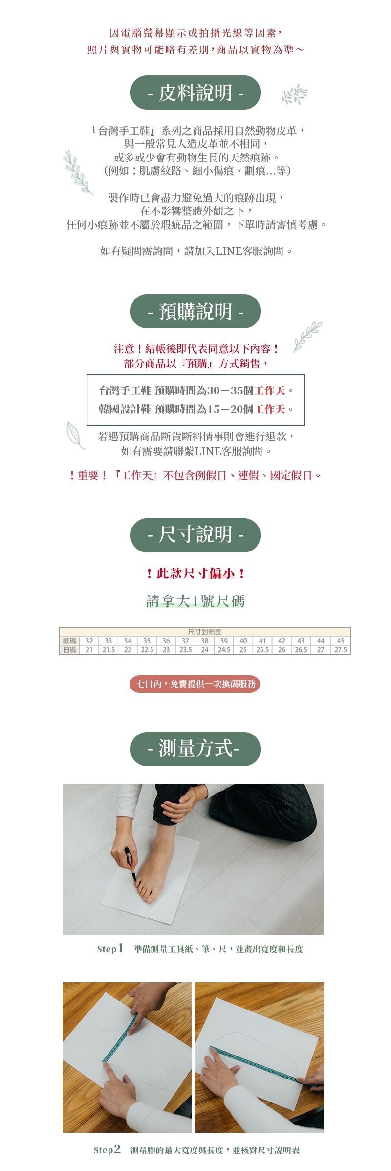 商品特色: ‧ 小羊皮材質 ‧ 軟Q鞋底 ‧ 可後踩設計 ‧ 台灣本地手工製造 ‧ 全顏色:黑● ‧ 小編試穿心得:版型正常,建議拿平常穿鞋尺碼