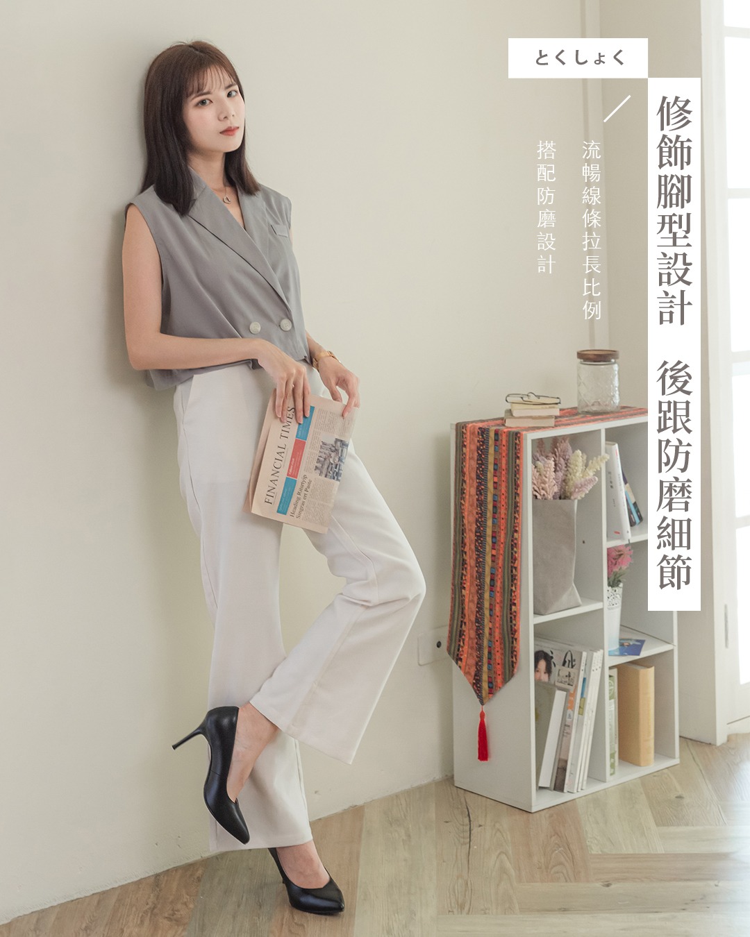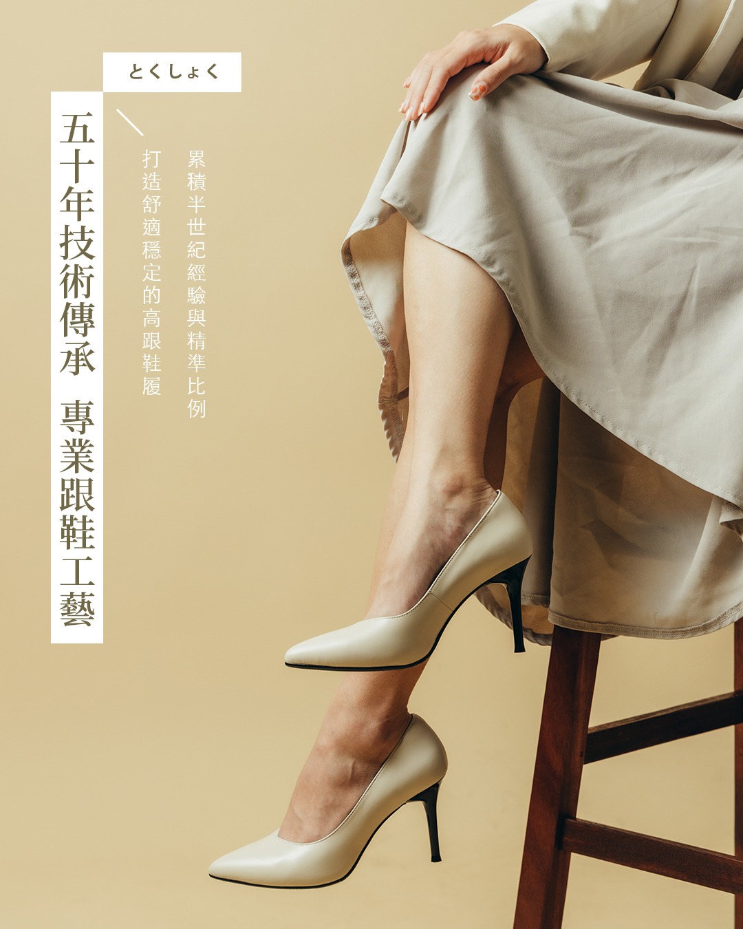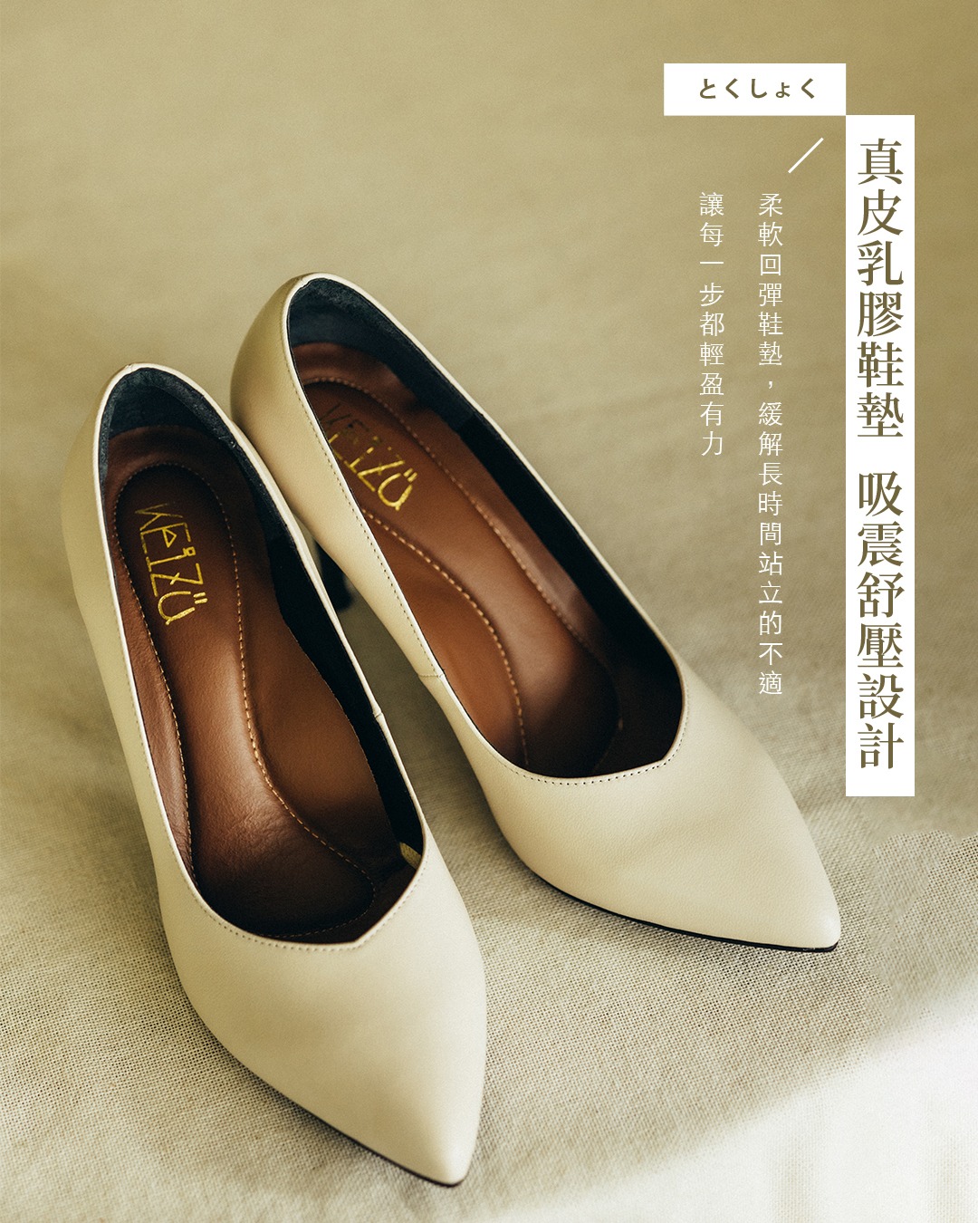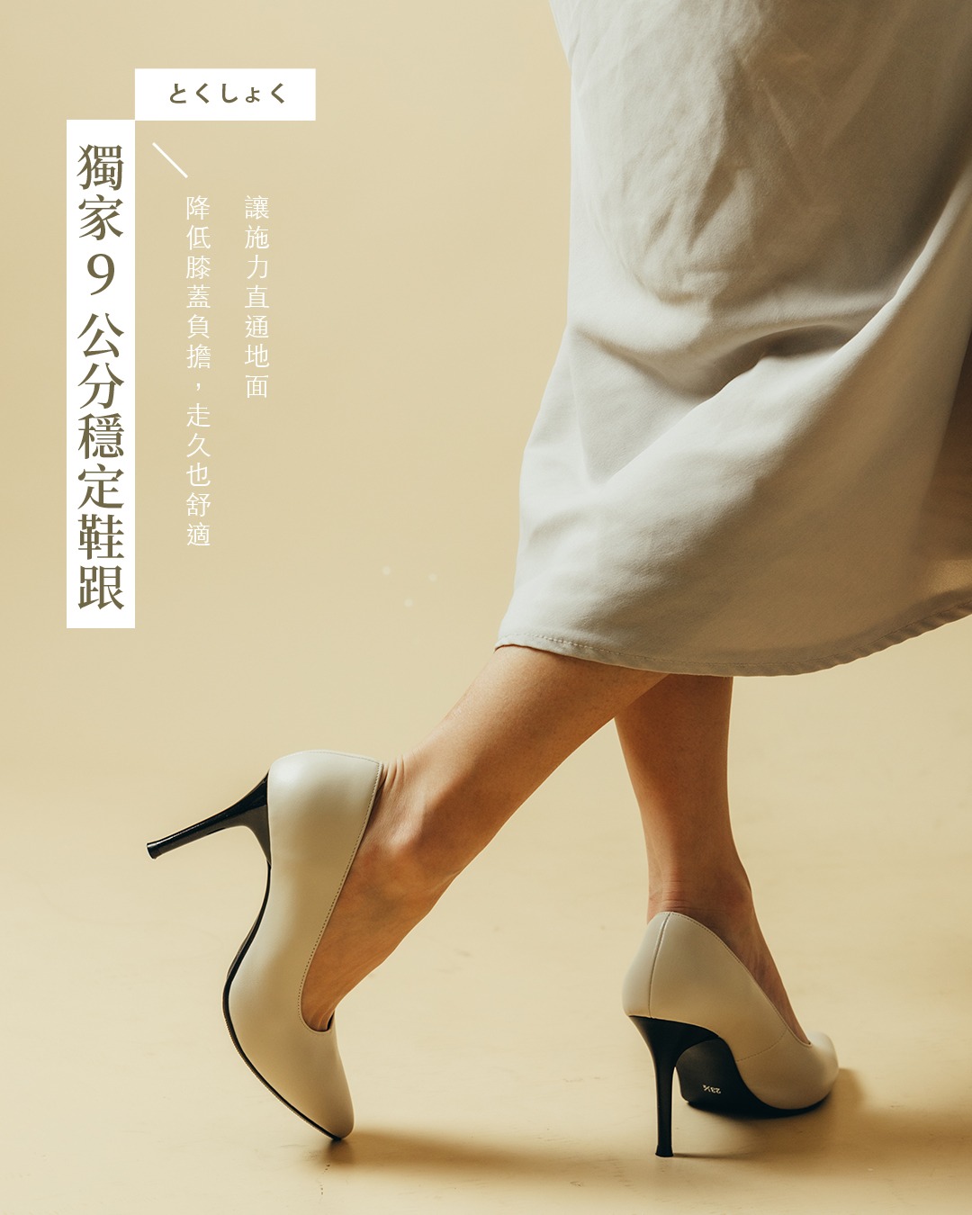 商品特色: ‧ 獨特開發鞋跟,穩跟不晃腳 ‧ 全真皮 進口牛皮材質 ‧ 豚皮氣墊鞋墊 ‧ 防滑PVC底 ‧ 台灣本地生產製造 ‧ 跟高:9CM ‧ 全顏色:黑● 米白● ‧ 小編試穿心得:版型正常,建議拿平常穿著尺碼